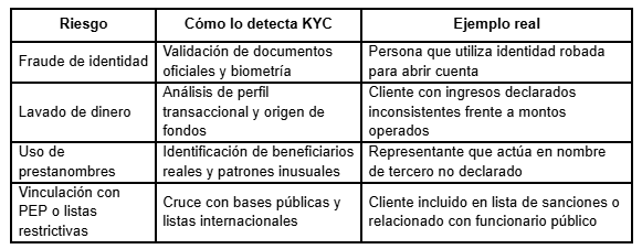 El proceso KYC no se limita a identificar a una persona, su propósito es detectar inconsistencias, relaciones riesgosas y patrones que podrían derivar en sanciones o pérdidas financieras. Cuando se aplica correctamente, permite anticipar conductas irregulares antes de formalizar una relación comercial o financiera.