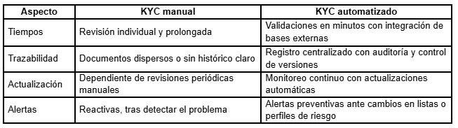 Cuando el proceso KYC depende de revisión manual, correos dispersos y documentos físicos, aumenta la posibilidad de omisiones, duplicidades o información desactualizada. Automatizar KYC no significa sustituir el criterio humano, sino estructurar el flujo para que cada validación quede registrada, trazable y sujeta a monitoreo continuo.